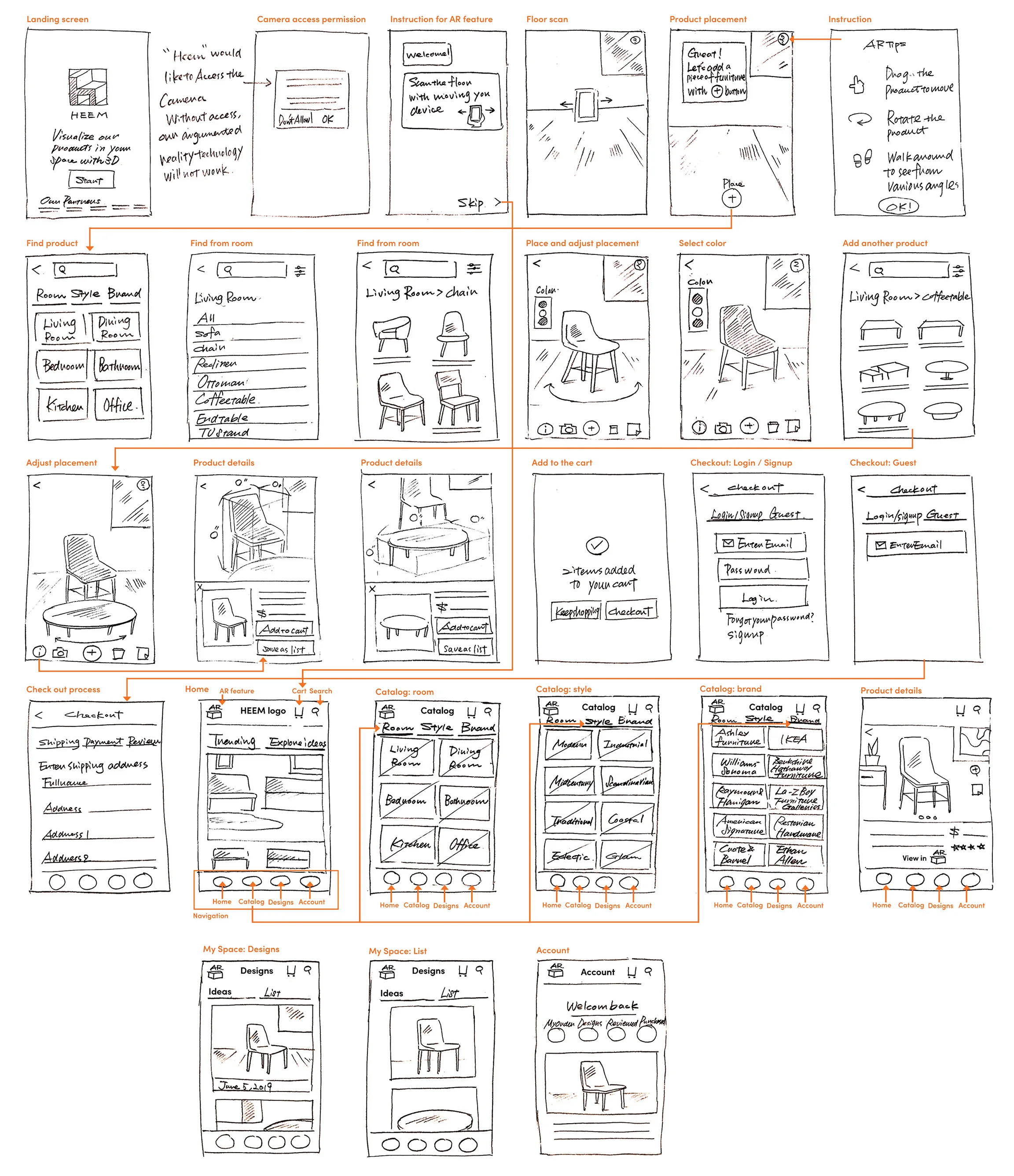 After specifying HEEM’s personas, I sketched out rough ideas and created an application map. The main functions of the app would be the “AR Feature”, “Catalog Search,” and “Checkout Process.” I incorporated these three key functions as utility navigation, since users may want to shift between a catalog mode and the AR mode freely when searching for products.