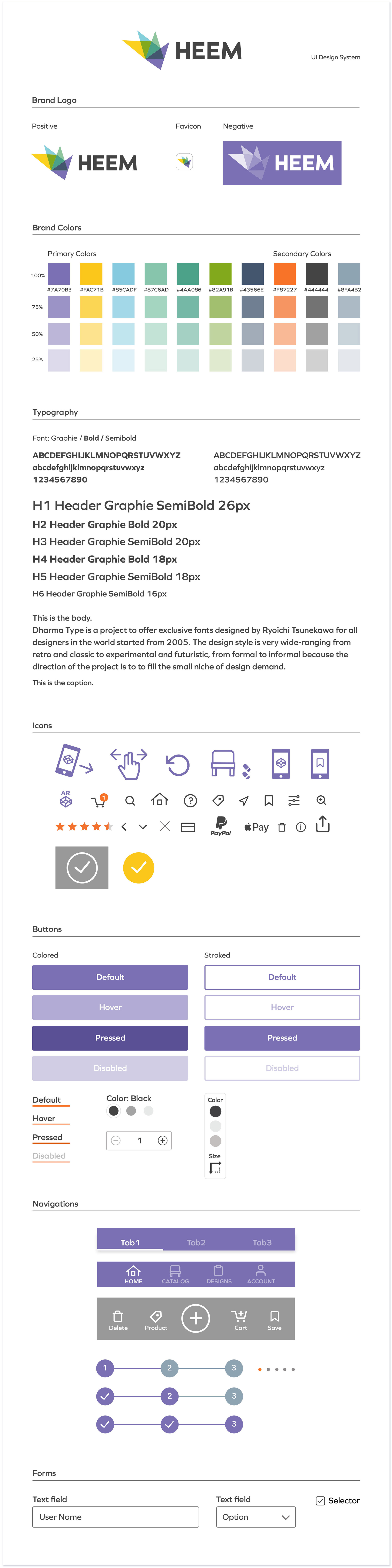 Once I clarified potential solutions for the next steps, I designed HEEM’s branding and also worked on UI components. HEEM expected to make the app more extensive and complex over time, offering not only AR but also VR for a more realistic view. Taking this into consideration, I made the branding logo focus on the technological features rather than products themselves. The keywords of the brand logo include “reproducibility,” “versatility,” “movement,” and “modern.”